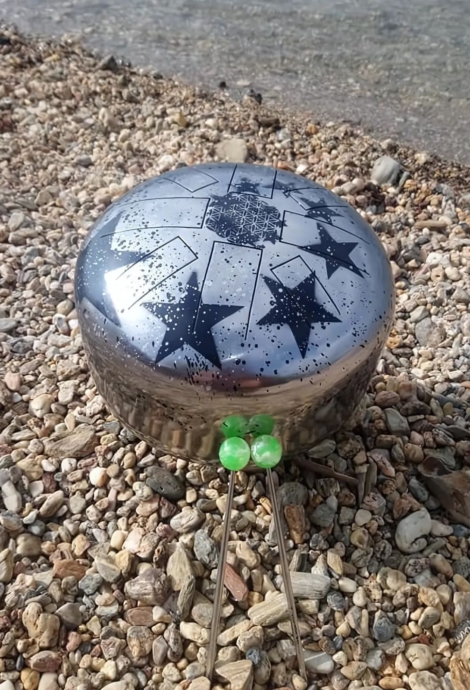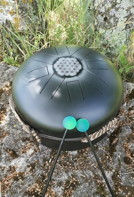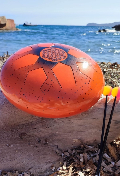 Fabriqué à la main par David dans notre atelier à Tourves, en France, le Tank Drum 432 Hz est conçu à partir d’une bouteille de gaz recyclée, transformée en un fût d’acier robuste. Huit lames vibrantes, découpées avec précision et accordées à la fréquence de 432 Hz, produisent des notes d’une pureté exceptionnelle. Un évent à l’arrière amplifie la résonance, créant des vagues sonores envoûtantes qui agissent comme une caresse pour l’âme. Une Fleur de Vie, peinte au centre de l’instrument, ajoute une dimension symbolique, amplifiant son énergie harmonisante.